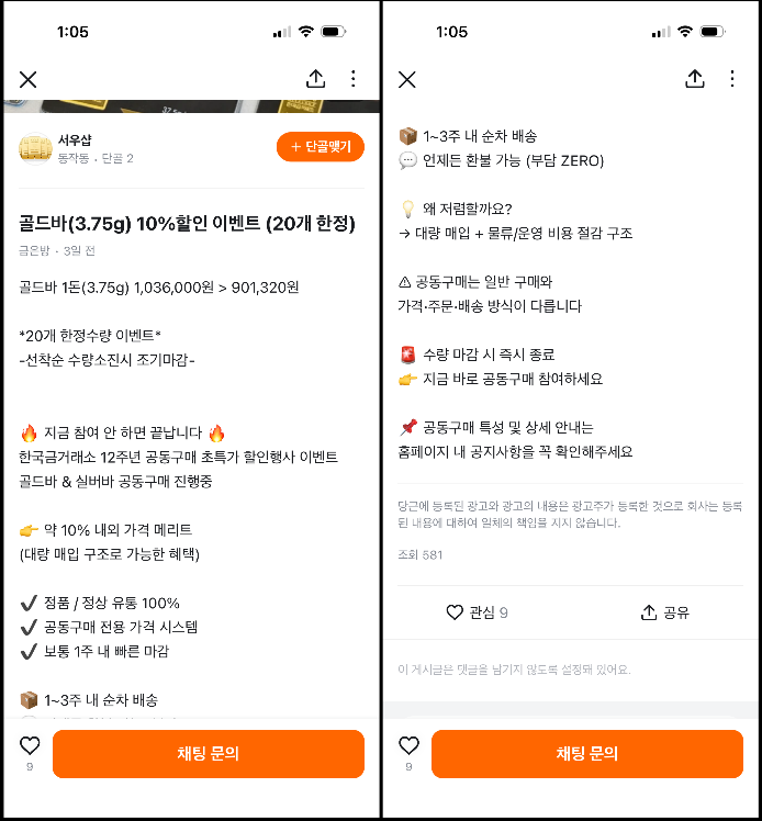 한국금거래소는 당근마켓, 카카오톡 오픈채팅방 등
